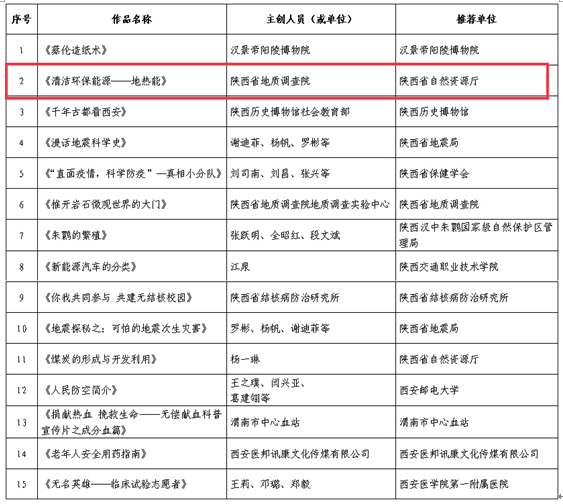 2021年9月23日,陜西省科技廳公布了2020年度陜西省優秀科普微視頻作品。經形式審查、專家評審與網上公示,評選出包括我中心制作的《清潔環保能源-地熱能》在內的15部2020年度陜西省優秀科普微視頻作品。